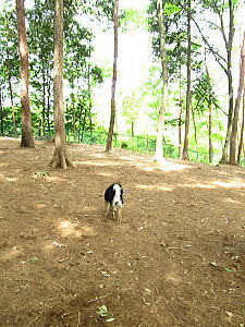 たらふく走って斜面で木を投げて遊び。