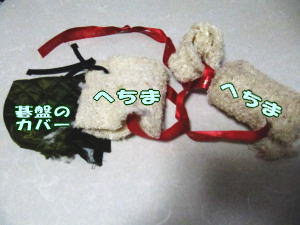 タマさんの遺品であるヘチマとヘチマと、碁盤の足を保護するカバー(福ッペがカジってムシった)を、ケーキ屋のリボンで結んだだけ。